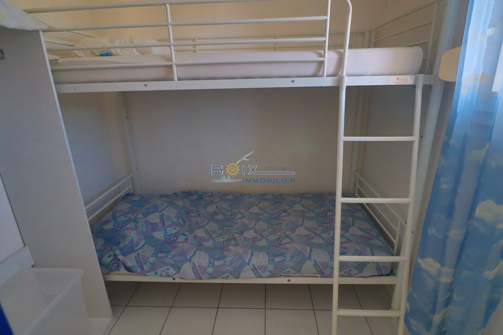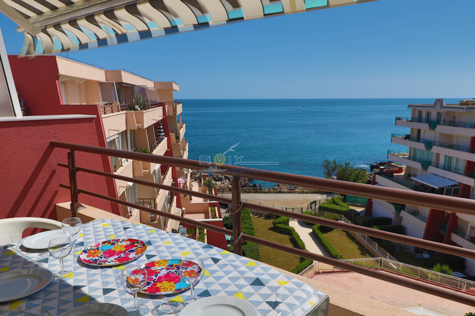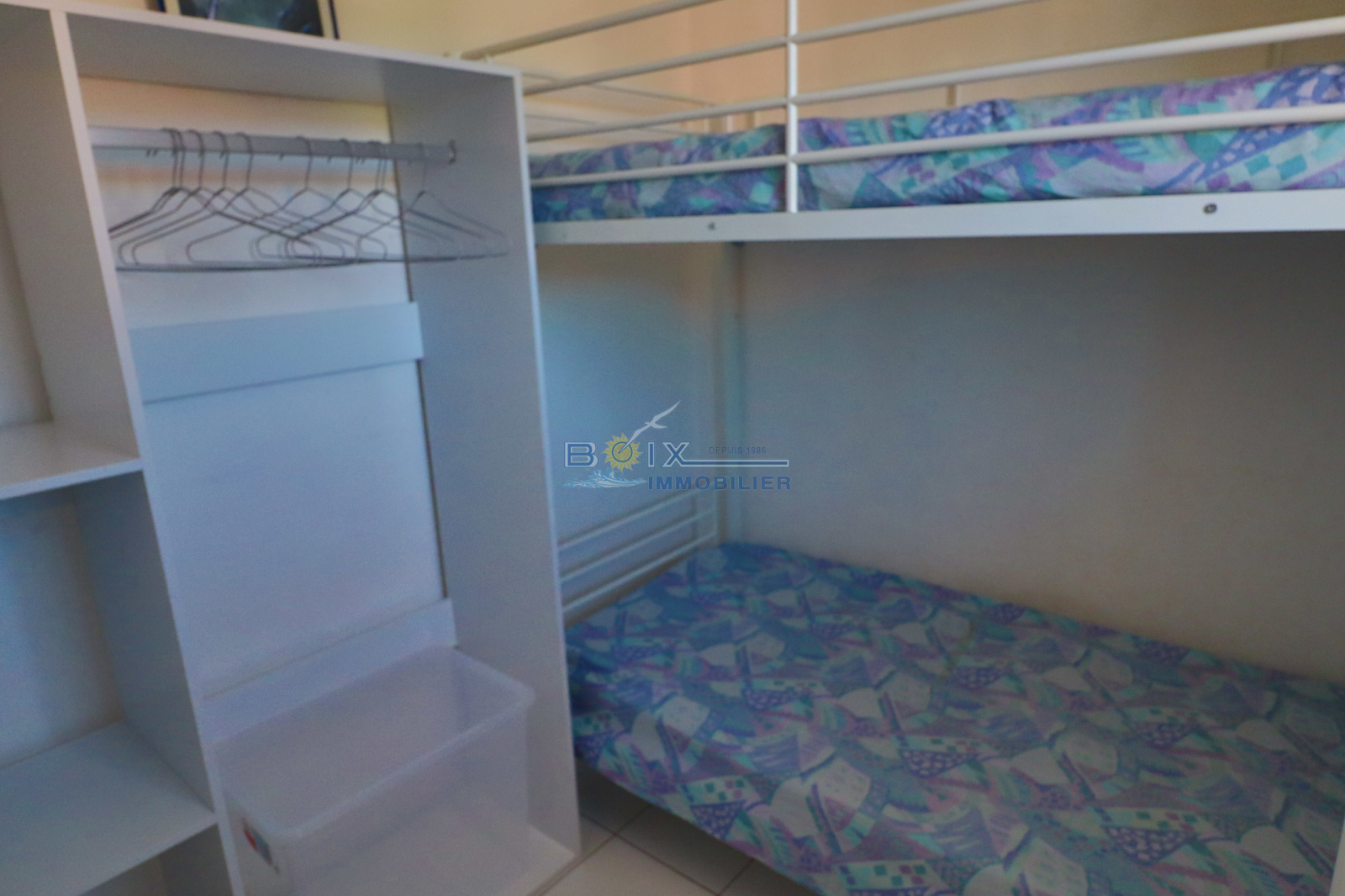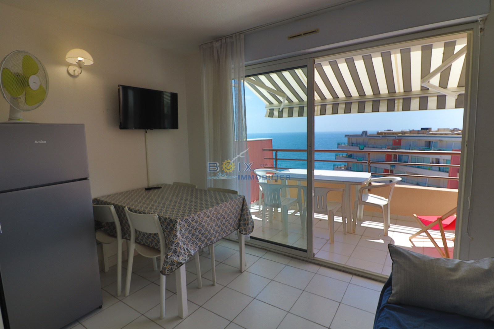 Location de vacances à Sète, quartier La Corniche, 2 pièces cabine situé au 5 ème étage d'une résidence avec piscine et ascenseur. Ce logement avec une très belle vue sur la mer et la piscine comprend : une chambre avec placard et lit double, une cabine indépendante avec 2 lits superposés, un séjour avec canapé convertible, une kitchenette équipée avec lave-vaisselle, plaques chauffantes, réfrigerateur et four à micro-ondes. La salle d'eau et les wc sont séparés. La terrasse équipée du salon de jardin donne sur la piscine et la mer. La résidence avec parking est idéalement située, plage du Lazaret à 100m, commerces à 200m arrêts de bus et restaurants. Hors saison: 380€/semaine. Trés haute saison: 860€/semaine. Bon plan hors juillet/août, en réservant 2 semaines consécutives, la troisième est offerte (en cas de chevauchement des périodes, la semaine offerte est celle au tarif le plus bas). N'hésitez pas à nous contacter pour les tarifs et disponibilités du lundi au samedi inclus 04.67.51.50.50 et infos@boix-immobilier.fr