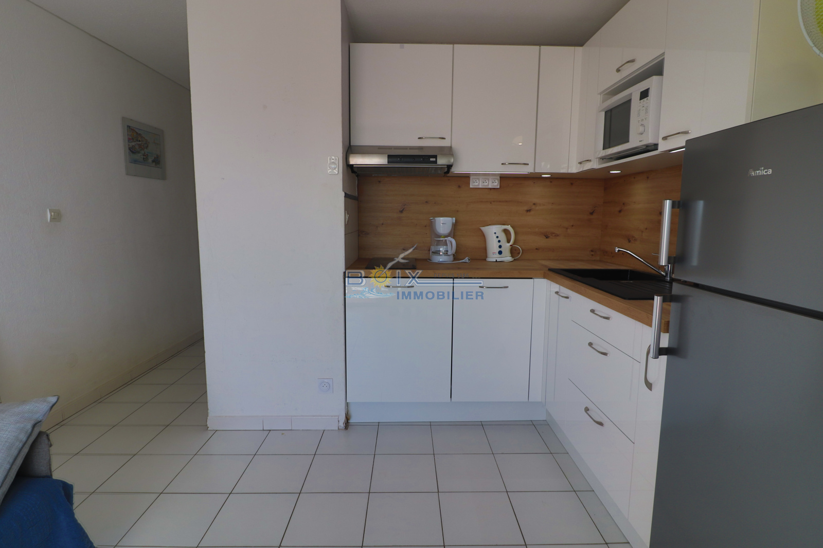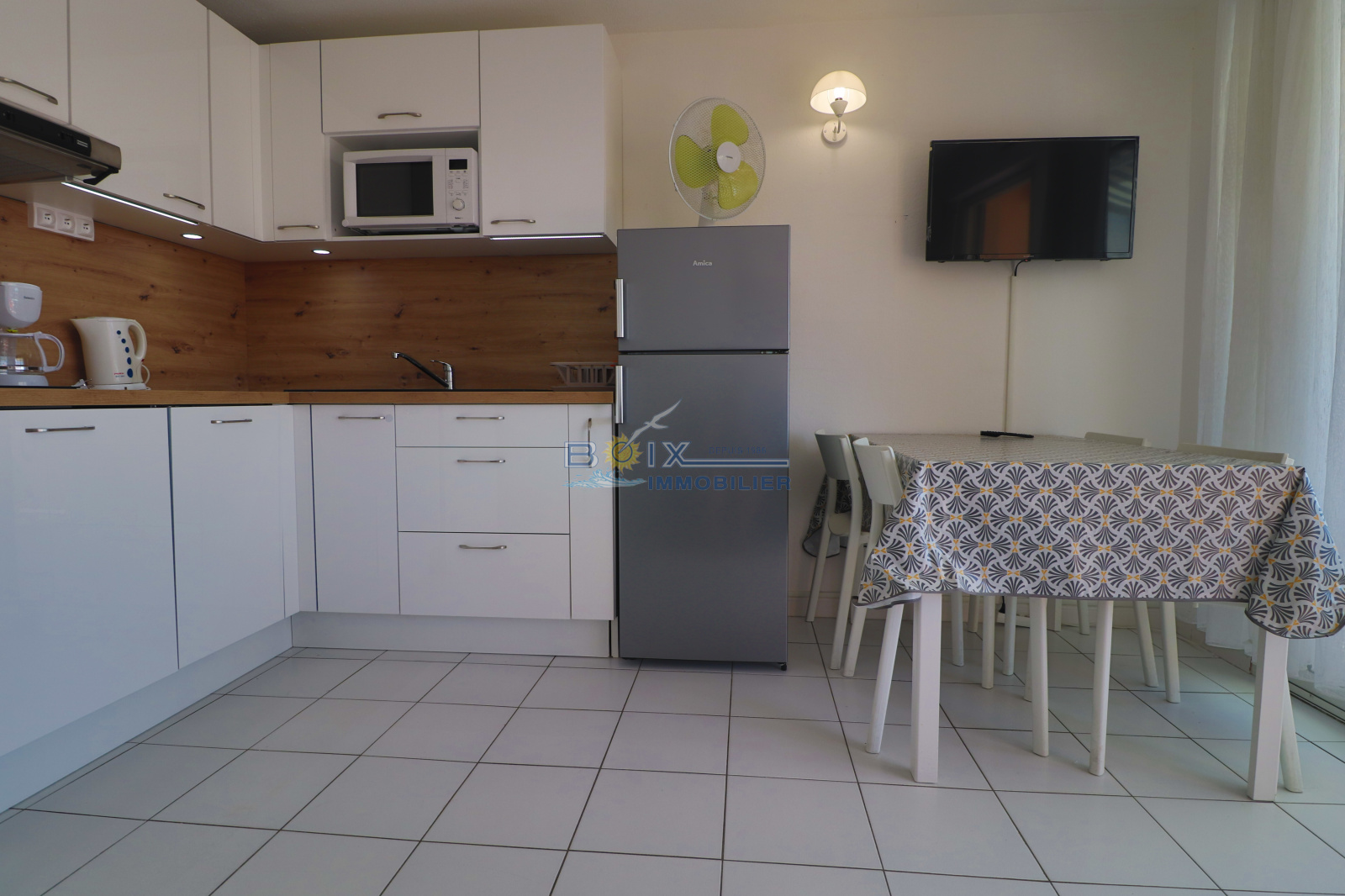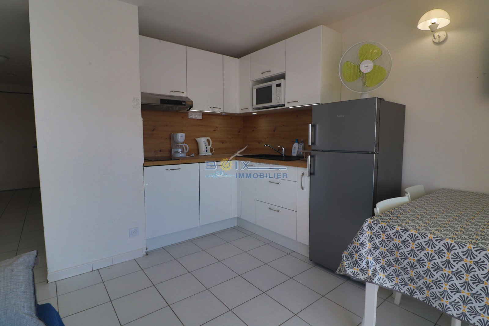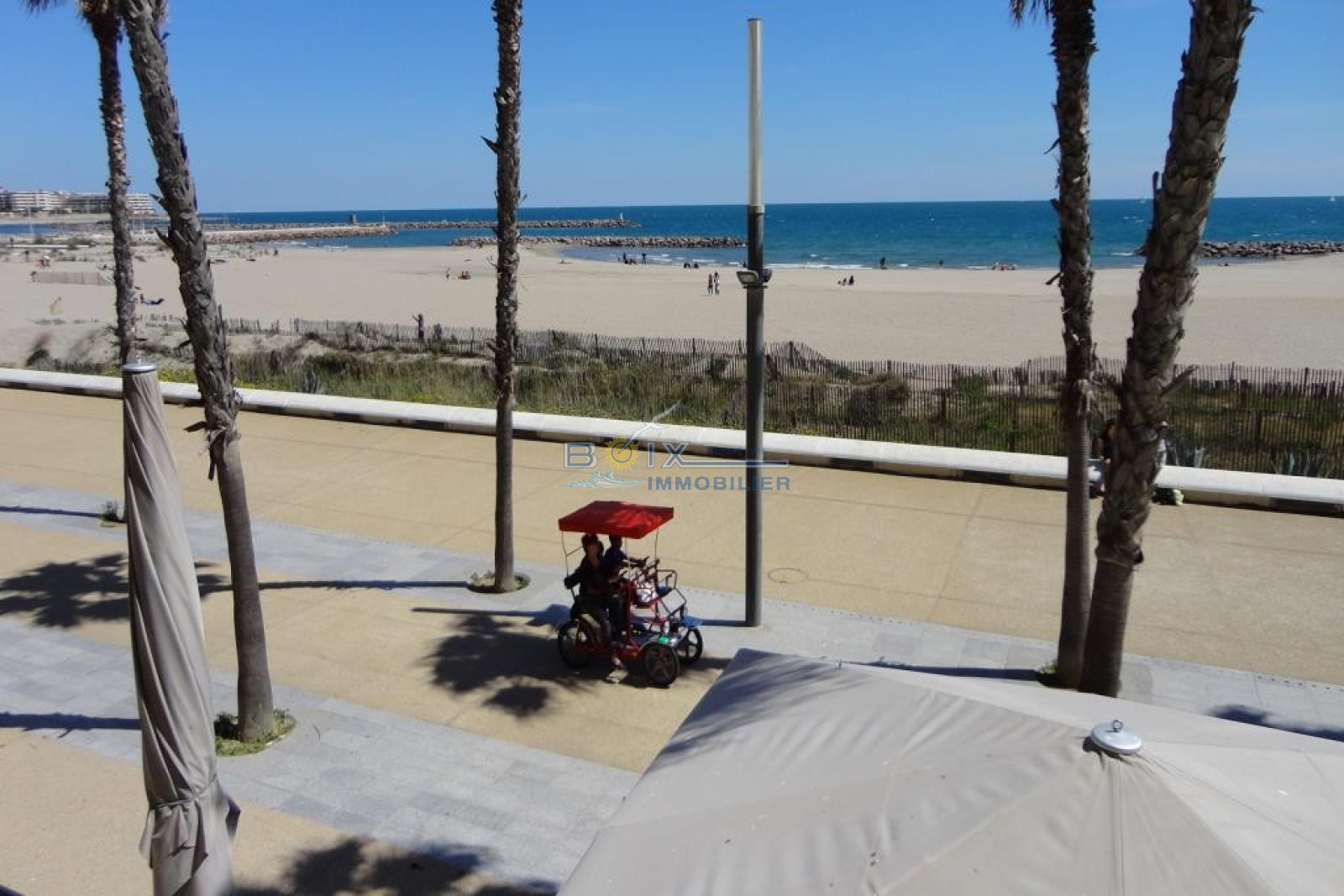 Location de vacances à Sète, quartier La Corniche, 2 pièces cabine situé au 5 ème étage d'une résidence avec piscine et ascenseur. Ce logement avec une très belle vue sur la mer et la piscine comprend : une chambre avec placard et lit double, une cabine indépendante avec 2 lits superposés, un séjour avec canapé convertible, une kitchenette équipée avec lave-vaisselle, plaques chauffantes, réfrigerateur et four à micro-ondes. La salle d'eau et les wc sont séparés. La terrasse équipée du salon de jardin donne sur la piscine et la mer. La résidence avec parking est idéalement située, plage du Lazaret à 100m, commerces à 200m arrêts de bus et restaurants. Hors saison: 380€/semaine. Trés haute saison: 860€/semaine. Bon plan hors juillet/août, en réservant 2 semaines consécutives, la troisième est offerte (en cas de chevauchement des périodes, la semaine offerte est celle au tarif le plus bas). N'hésitez pas à nous contacter pour les tarifs et disponibilités du lundi au samedi inclus 04.67.51.50.50 et infos@boix-immobilier.fr
