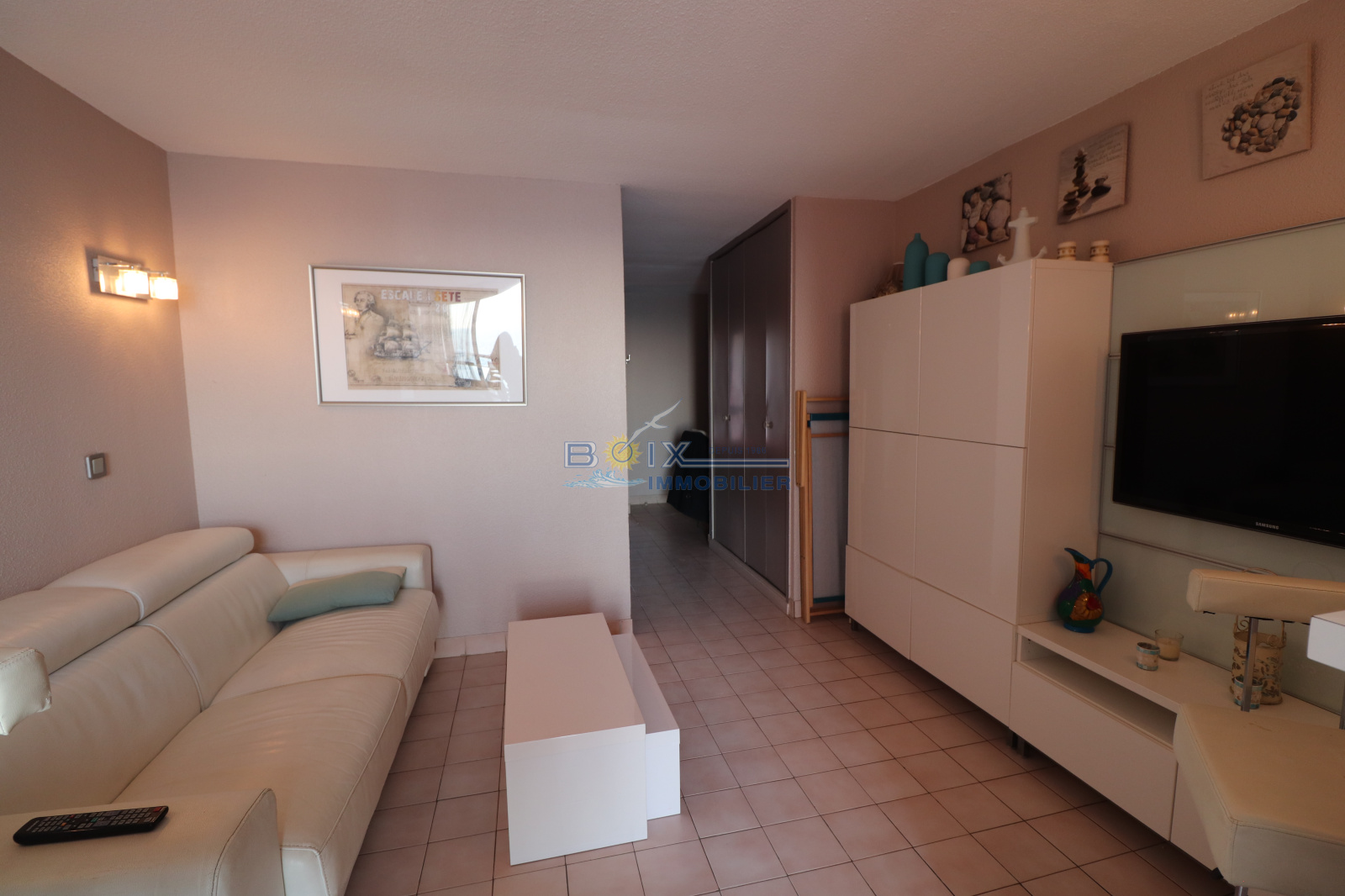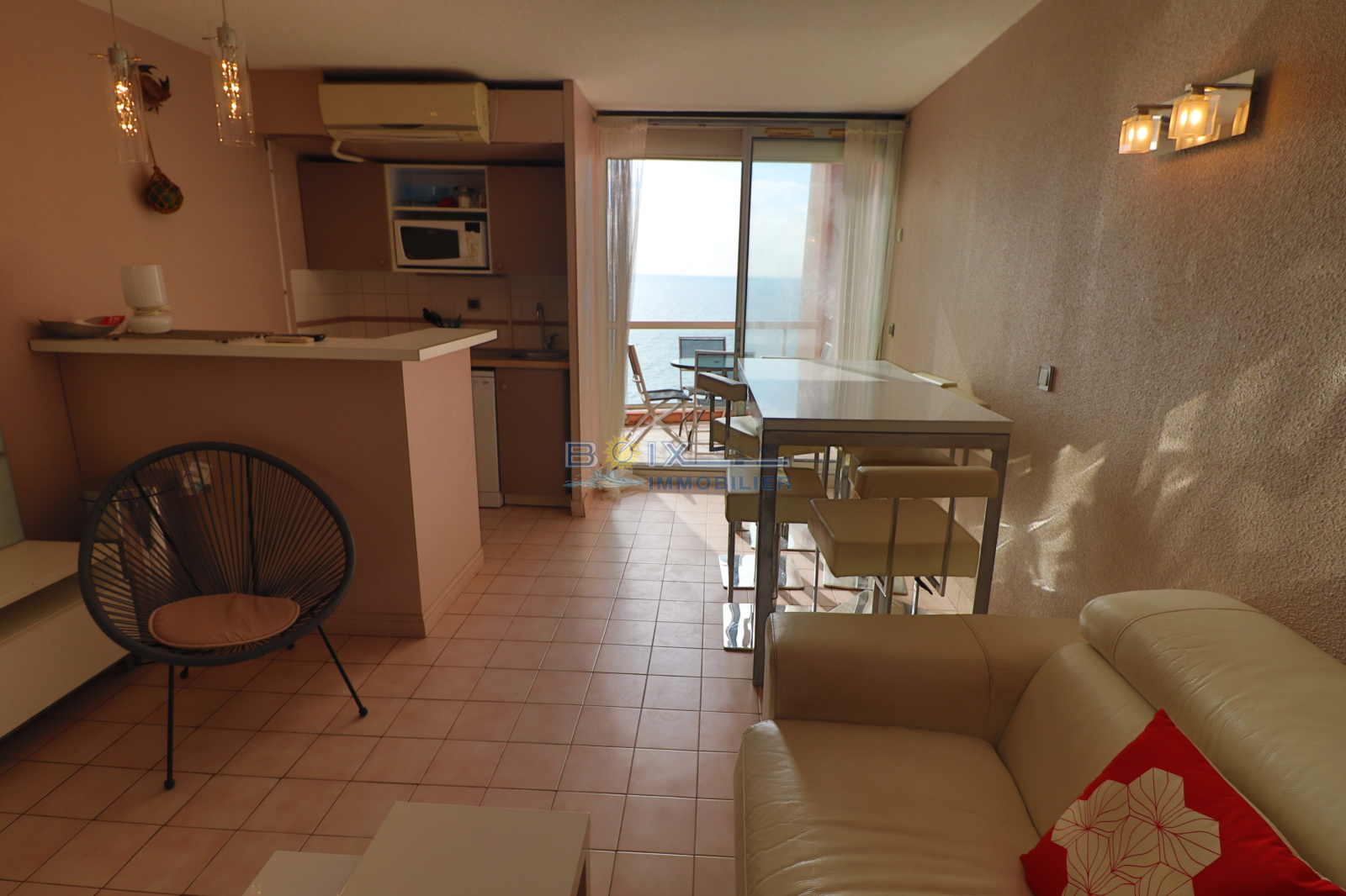Location de vacances à Séte, quartier de la Corniche, dans une résidence face à la mer à proximité des plages et offrant piscine, pataugeoire, tennis, terrain de volley, boulodrome et laverie. Cet appartement 2 pièces pour 4 personnes, climatisé comprend un séjour avec canapé convertible, télévision, une kitchenette équipée avec four à micro-ondes , plaques chauffantes, réfrigerateur, lave vaisselle, salle d'eau et wc séparés, une chambre avec lit double et lits superposés. Terrasse face à la mer avec salon de jardin. Proximité plages (100métres) et commerces et bus (200m). Hors saison : 510€/semaine. Trés haute saison : 930€/semaine. Bon plan hors juillet/aoùt, en reservant 2 semaines consécutives, la troisiéme est offerte (en cas de chevauchement des périodes, la semaine offerte est celle au tarif le plus bas). N'hésitez pas à nous contacter pour les tarifs et disponibilités du lundi au samedi inclus 04.67.51.50.50 et infos@boix-immobilier.fr