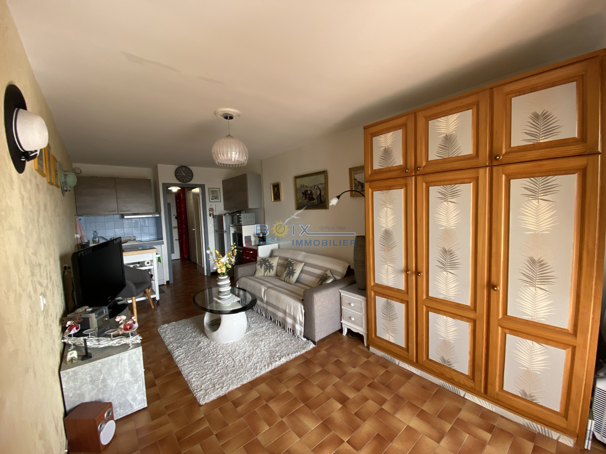 une entrée avec placards donnant la salle d'eau (entièrement refaite) et des WC séparés suivis de la pièce principale et son "coin cusine équipée" (plaques induction, lave linge, Frigo combi congélateur, mini four et micro-ondes), canapé cosy, avec un lit escamotable pour 2 personnes avec TV écran plat. Le tout agrémenté d'une superbe loggia d'environ 5 m2 avec une vue sur la mer imprenable.